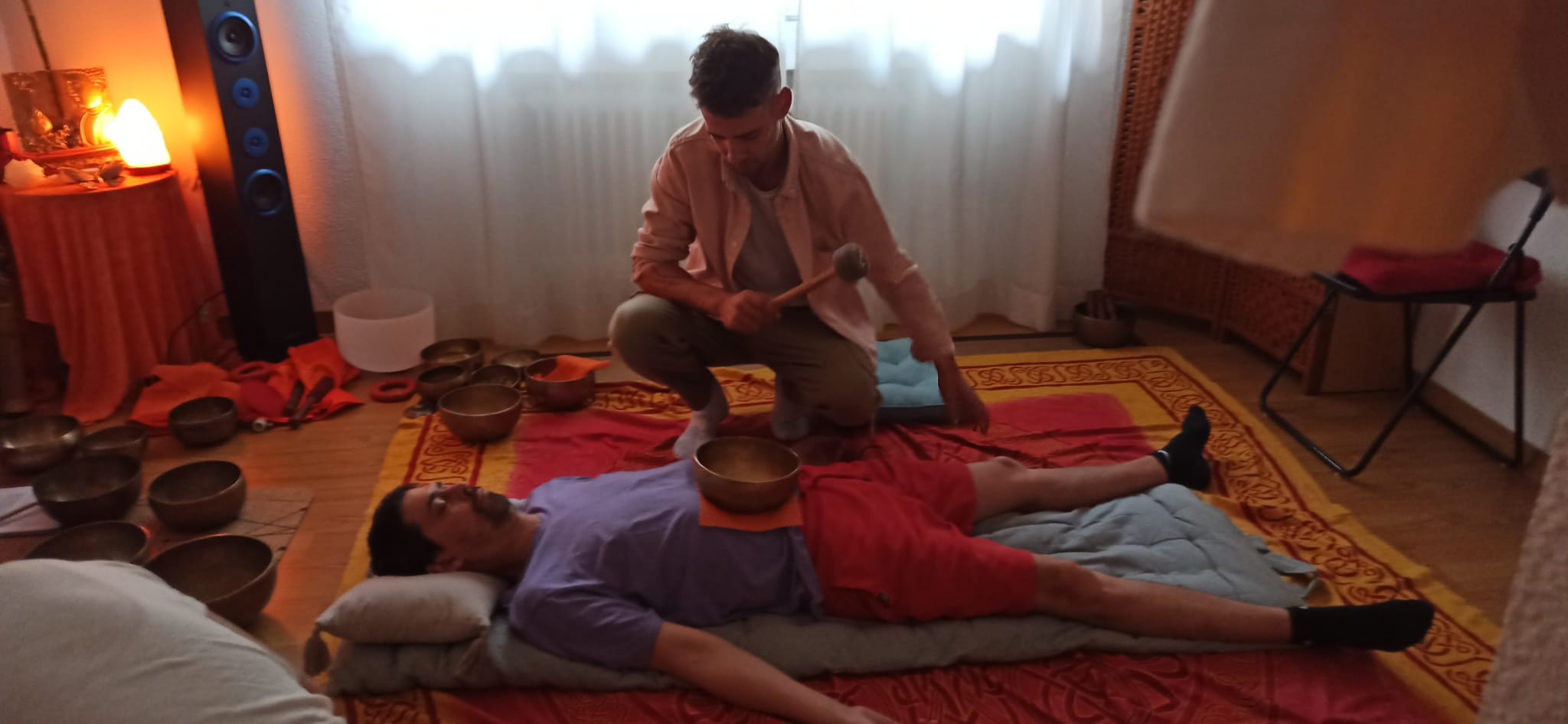 Practicaremos ejercicios para poder hacerlos en casa. Aprenderás a realizar un masaje con los Cuencos Tibetanos. Recibirás un masaje con la vibración del sonido. Sentirás la vibración de los cuencos con agua comprobando cómo sube el nivel energético del agua del grifo, con la vibración del sonido.